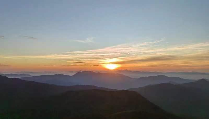 天光慢慢亮起来,淡蓝色的光晕染了半边天,云海从山谷里慢慢升腾,像棉花糖似的裹着山峰。我们攒着劲儿往顶峰爬,等站在山顶时,星辰渐渐隐去,第一缕金光突然刺破云海,瞬间把天空染成了橙红色。风里飘着欢呼声,我和爱人、艳相视而笑,眼眶竟有些发热——那些在黑夜里踩过的碎石路、忍着的疲惫、冻得发僵的手脚,在这一刻都有了意义。