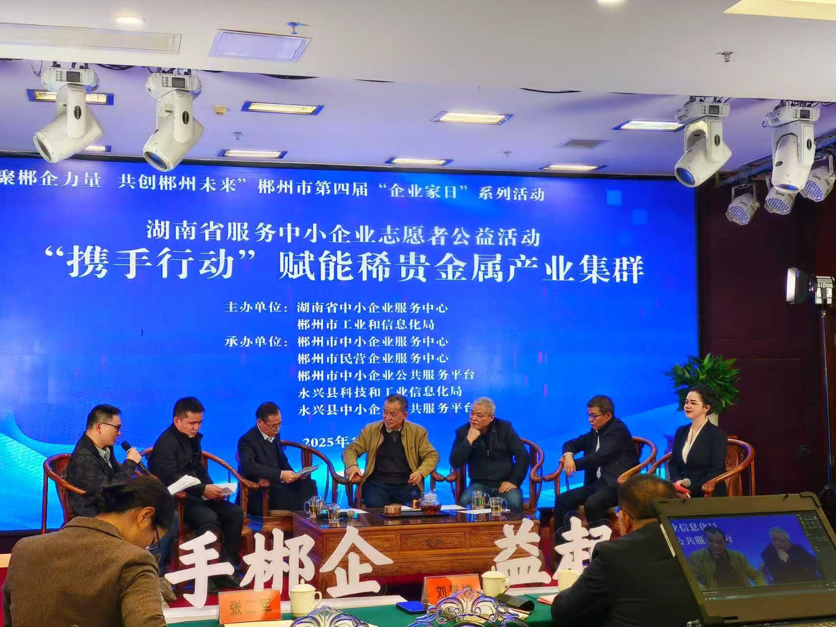 湖南日报·新湖南客户端11月7日讯(通讯员 李媛 李容琛 曹腾)金秋送爽,银都聚智。11月4日,由湖南省中小企业服务中心、郴州市工业和信息化局主办的湖南省服务中小企业志愿者公益活动“携手行动・郴州永兴站”暨郴州市第四届“企业家日”系列活动在永兴县荣裕国际大酒店举行。省内外专家志愿者、市县政企代表及30余家稀贵金属企业负责人齐聚,以“公益帮扶+政企联动+精准问诊”模式,为郴州稀贵金属产业集群破局、中小企业成长注入动能。