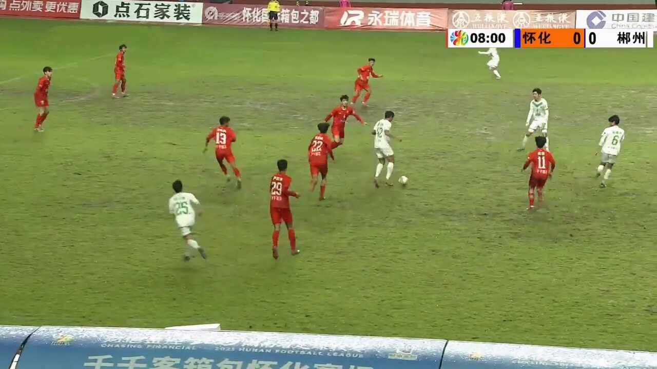 比赛伊始,郴州队大举压上,但雨水致场地湿滑,球员多次滑倒,足球轨迹难控。双方你来我往,均势明显。第36分钟,郴州队多次威胁球门未果。伤停补时,怀化队单刀进攻,郴州队守门员刘翔精彩扑救,但怀化队抓住最后一次进攻机会,22号伍宏卓角球破门,上半场怀化队1:0领先。