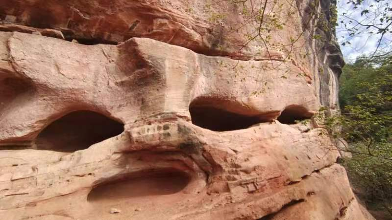 最令人唏嘘的,是坦洞右侧规模庞大的石凿工程。岩体被整齐地凿出方形空间、长条石梁、卧床状石台,近两米长的卷草连枝纹虽被风化得模糊,却仍能看出当年工匠的精雕细琢。曾纪诗在《金紫岩记》里描述的“龙宫祷雨立应”“石莲宝盖高悬”“岩际有仙人抚杖”,如今只剩岩壁上大小不一的洞穴——有的能容人栖身,有的可搁置器物,却再也无人知晓这些凿痕背后的真正用途,是古人的修行之所,还是储物之地?唯有天王楼台岩壁上的蜂窝景观依旧壮丽,数百平方米的岩壁上孔洞层层叠叠,这种丹霞地貌特有的地质奇观,在全国都极为少见,只是少了香火映照,丹霞红岩也失了往日的温润,只剩一片冷硬的赭色,透着岁月的苍凉。