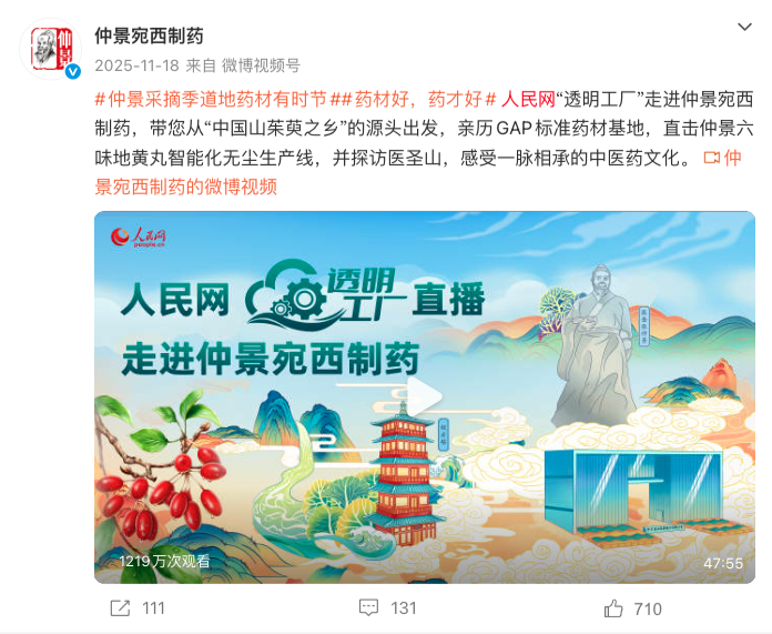 首先是秋天交出的“透明答卷”。品牌在伏牛山腹地发起“仲景采摘季”溯源直播,同步上线话题 #仲景采摘季道地药材有时节#。没有滤镜与渲染,镜头真实记录下了药农依照古法、顺应节气采收药材的全过程,并无缝衔接至现代“透明工厂”的精密流水线。