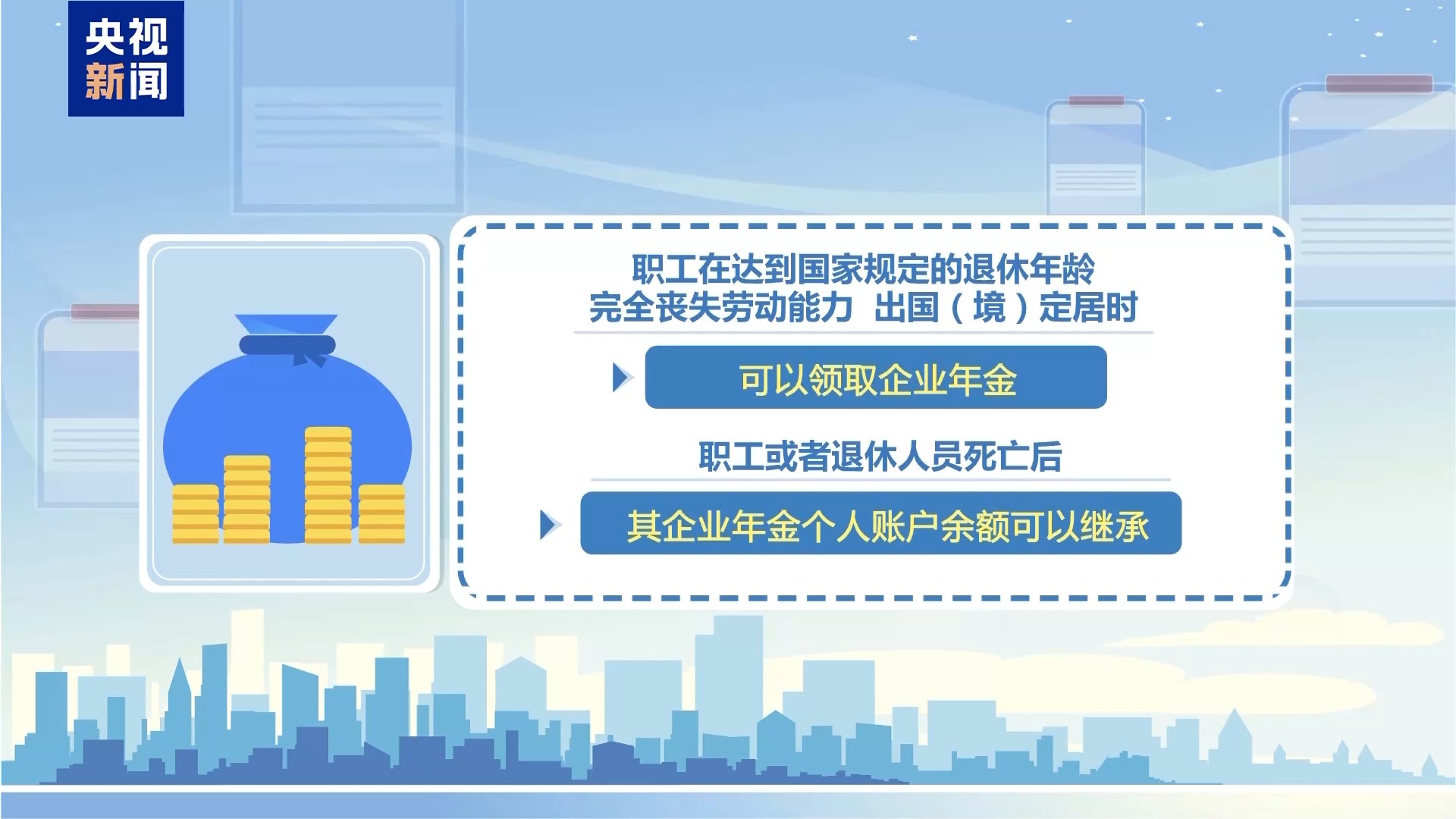 职工在达到国家规定的退休年龄、完全丧失劳动能力、出国出境定居时,可以领取企业年金;职工或者退休人员死亡后,其企业年金个人账户余额可以继承。