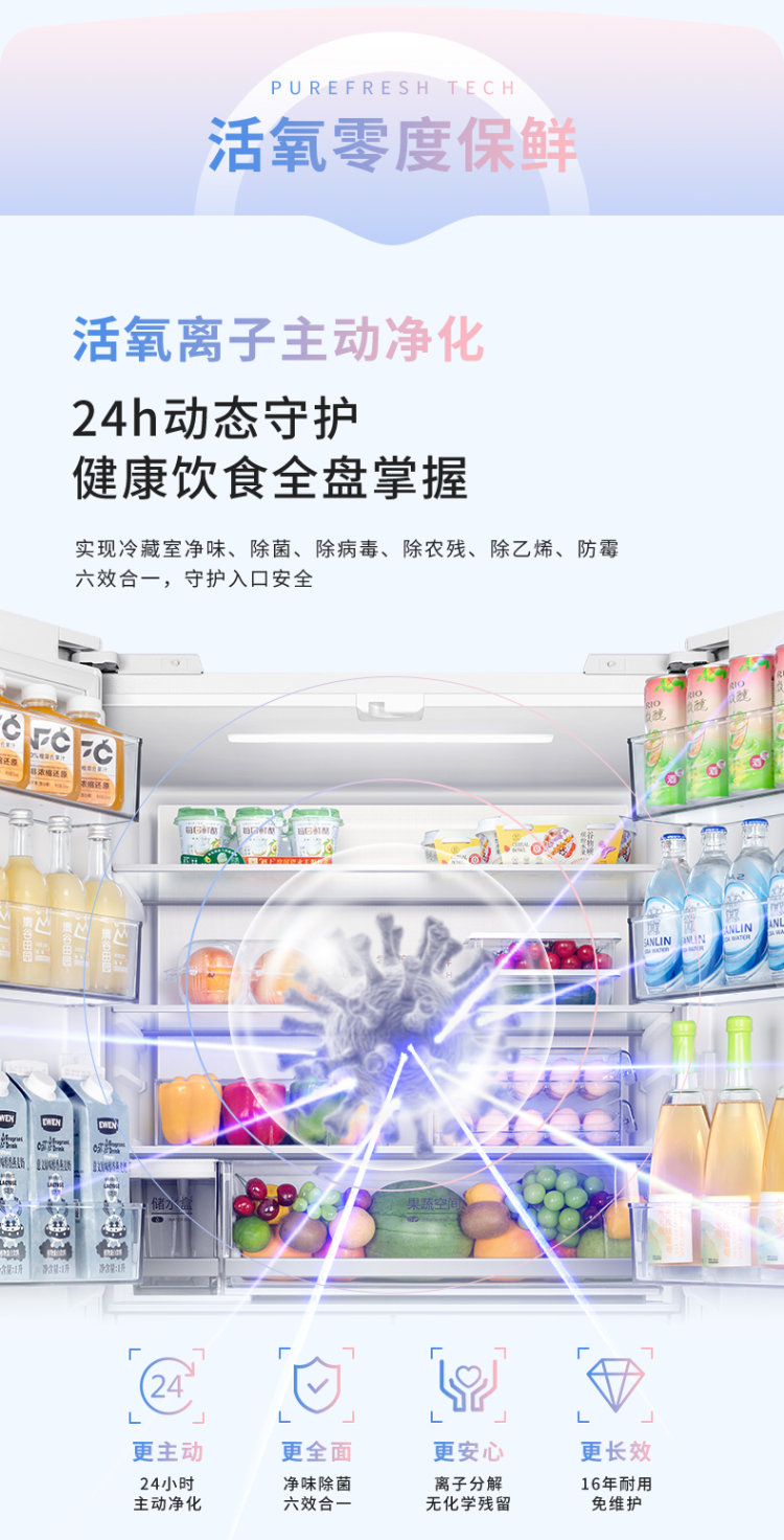 其超净光波养鲜技术利用蓝光、红光与超能量光波(450nm蓝光、660nm红光与315nm光波的结合)能在短短9分钟内对食材表面及搁架进行除菌,不仅有助于延长食材的保鲜期,还能有效保持维生素C、D、胡萝卜素等营养成分,达成维生素提升46.84%的显著效果。这对于注重健康的消费者无疑是一大福音。