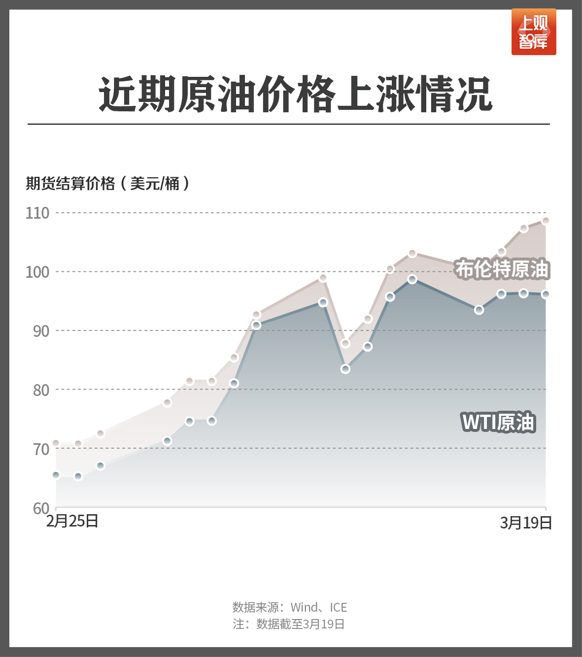 布伦特原油价格从2月底的70美元/桶快速上涨,3月19日,已经触及111美元/桶,WTI原油也接近100美元/桶。