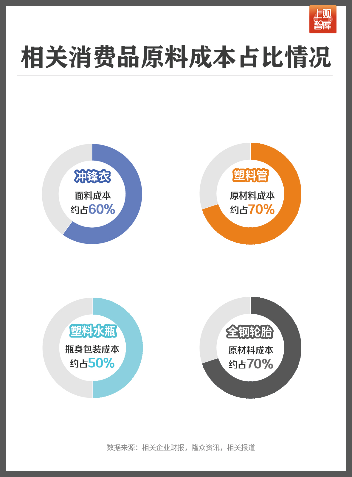 超市售卖的各种瓶装饮料瓶,其原料则是塑料。上观智库解读某矿泉水饮料品牌的财报发现,瓶身与包装约占总成本的50%,而瓶身与包装成本中,PET聚酯又占到了50%。也就难怪,印度瓶装水龙头Bisleri近期已将产品价格上调了11%。
