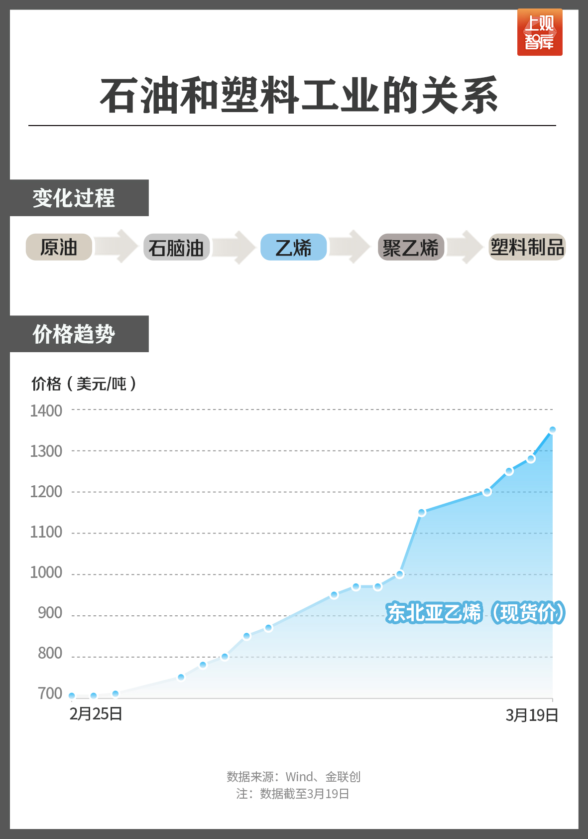 塑料的主要原料如聚乙烯(PE)和聚丙烯(PP)均来源于石油,虽然乙烯的合成并非只有石油这一条路径,但在中国、欧洲、东南亚和日本,石油路线仍占主导,所以原油价格上涨对这些地方的影响更为明显。