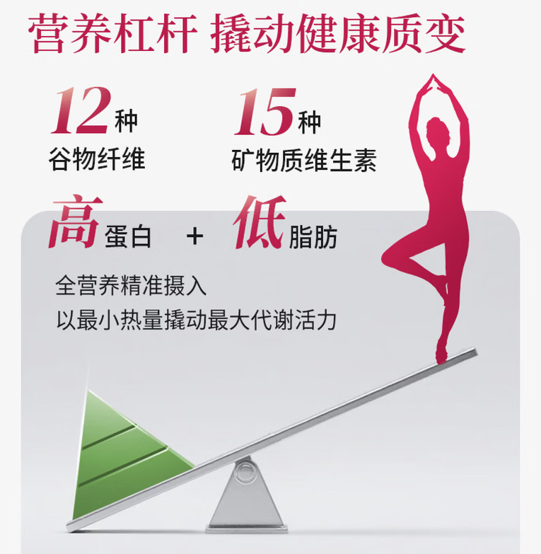 对标《中国居民膳食指南》,每100g含31.1g蛋白质(PDCAAS评分1.0,氨基酸配比满分),同时科学配比15种矿物质(如钙210mg、铁3.2mg)维生素(尤其B族对缓解疲劳重要),12中谷物纤维及24种8大类关键营养素。配方目标很明确:在减脂期守住精力与免疫力,避免传统节食导致的“体重下降、状态同步崩溃”。