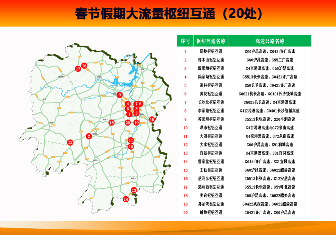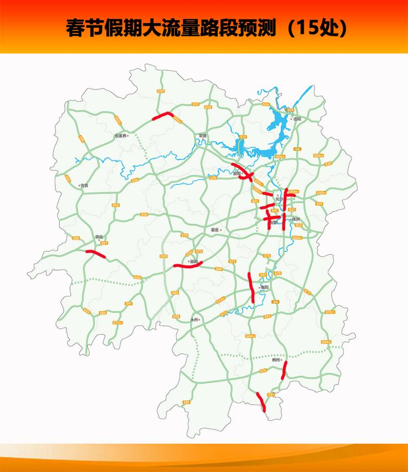 春节假期小型客车实施免费通行政策,短途探亲旅游流量增幅大假期省内大流量路段主要集中在G5513长张高速长沙段、益阳段、张家界段;G4京港澳高速长沙段、湘潭段、郴州段G60沪昆高速湘潭段、邵阳段怀化段G0421许广高速湘潭段衡阳段、郴州段G6021杭长高速长沙段S20平洞高速益阳段;S50长芷高速长沙段