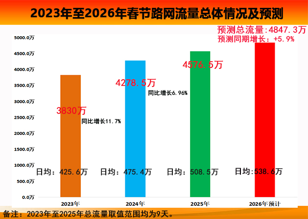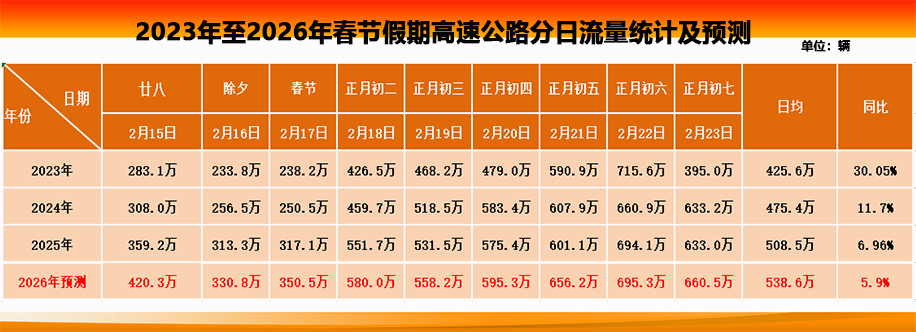 预计2026年春节假期,全省高速公路出入口通行车辆总数为4,847.3万辆,同比增长约5.9%,日均流量538.6万辆,约为平日的2.2倍。流量高峰时段主要集中在正月初五至初七(221日至23日),此峰值段总流量预计为2,012万辆,日均670万辆,可达平日流量的2.8倍,其中222日(正月初六)达695,为假期最高峰路网整体高位运行。