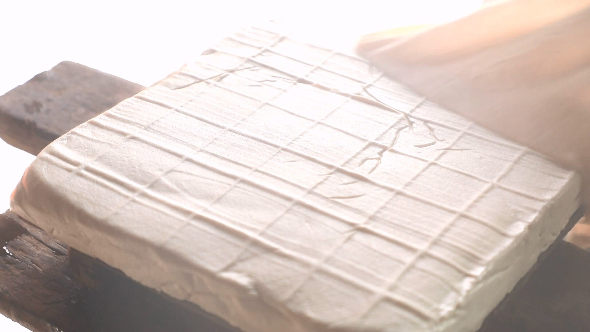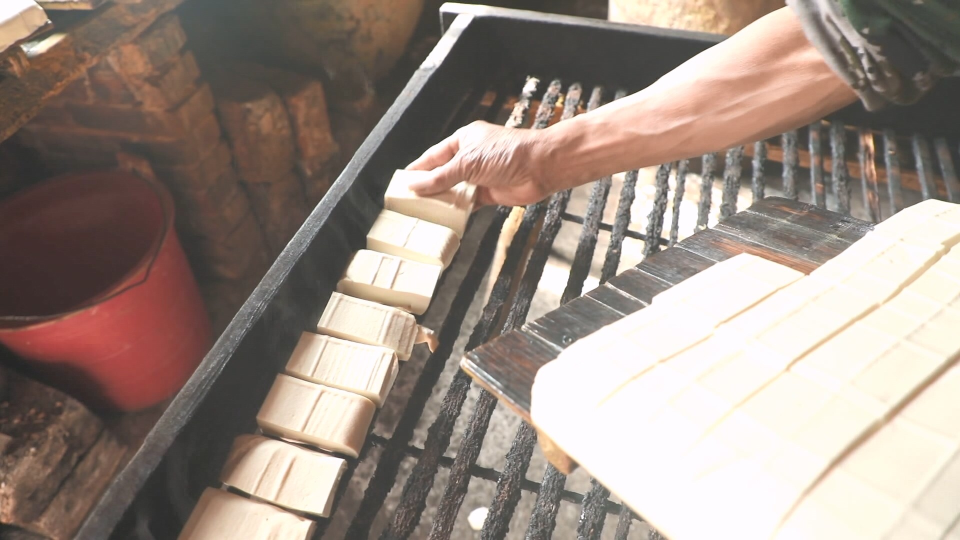 打浆过后,滤浆成了决定豆腐口感的关键一步。细密的棉纱布,细细筛去豆渣,留住的是马田豆腐滑嫩弹润的根基。历经浸泡、磨浆、打浆、滤渣等多道繁琐工序,热气腾腾的新鲜豆腐终于出锅,白嫩的质地在冬日晨光里透着温润的光泽,而这,不过是马田豆腐制作的半程旅途,烟熏,才是赋予它独树一帜风味的灵魂工序。