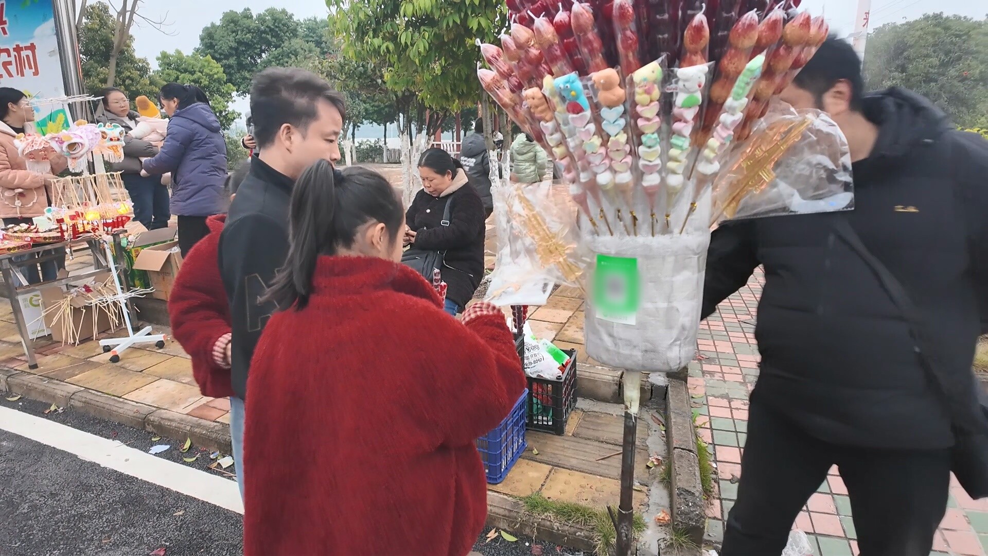糖葫芦商家赵英杰:“我从3点钟就开始准备冰糖葫芦,专程从耒阳那边赶了过来。平常大概能卖个二、三百块,今天特意多准备了一些,借着倒龙灯、闹元宵的人气,希望能有更好的销量。”