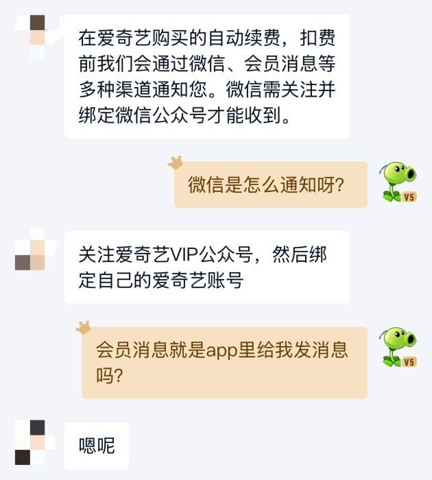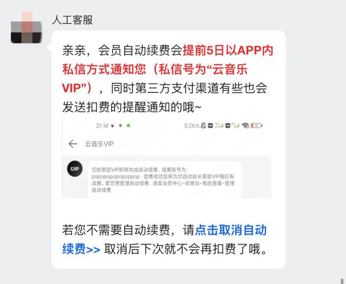 记者就此问题咨询了网易云音乐客服,得到的回复是自动续费会提前5日以APP内私信方式通知;咨询爱奇艺客服则获悉,开通普通自动续费后,扣费前会通过微信公众号(需关注且绑定爱奇艺VIP会员)、会员消息等渠道进行通知。