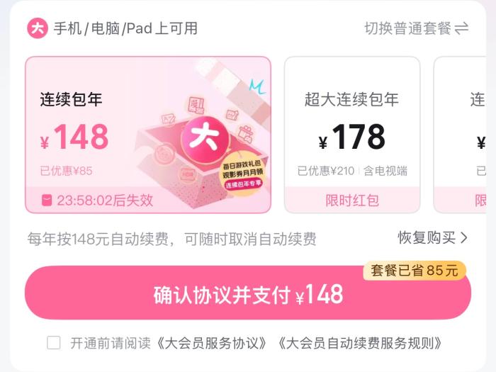 以B站大会员购买页面为例,页面首选套餐均为连续包年、包季、包月,普通大会员套餐的选择入口,仅隐藏在一行灰色小字中,需主动点击才能切换。