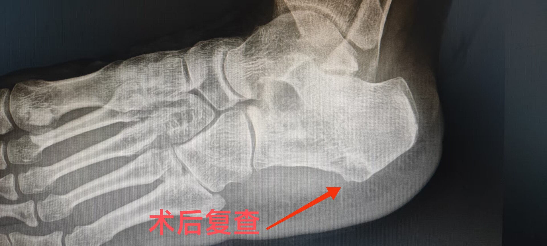 患者李女士被左足跟疼痛困扰了5年多,尤其是晨起下床的第一步疼痛最为剧烈。她尝试过冲击波、封闭针和理疗,但症状反复,最近甚至开始跛行,生活质量大受影响。术前X光显示,她的跟骨结节处有明显的“鸟嘴状”骨刺。