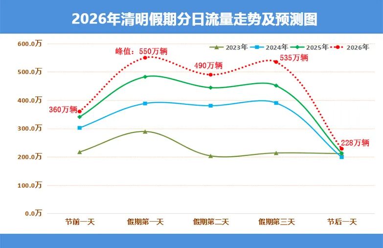 根据历年清明假期路网数据走势分析,预测2026年清明假期,全省高速公路出入口总流量为1,575万辆,较2025年同期增长14.3%,日均流量525万辆,为平日流量的2.1倍。预判4月4日(假期首日)为峰值日,流量为550万辆,为平日流量的2.3倍。